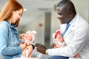 Things were progressing very quickly and a delivery was imminent. Thankfully the staff at the Sammon Family Birthing Center at the Wynn Hospital was ready. Dr. Kwaku Amankwah helped successfully deliver the girls and Dr. Rebecca Deeley one of two neonatologists at the Wynn Hospital, and a team of neonatal nurses, immediately began caring for them once they were delivered.