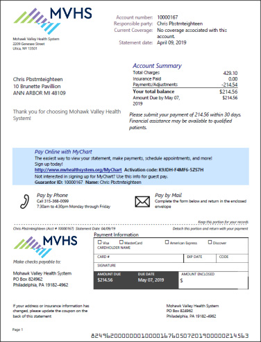 MVHS patients will now have the ability to access their bills online or via the MyChart mobile app. You can sign up by visiting mychart.mvhealthsystem.org and using the activation code from your “After Visit Summary”. After signing up, you can also choose to receive paperless e-state­ments rather than hard copy statements. Please be aware that all hard copy statements will now look different. Here is an example of the new billing statement: