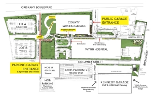 A parking garage is also available immediately adjacent to the hospital (see maps below – click to enlarge). Public parking for patients and visitors is free for those coming to the Wynn Hospital and is available on the first and second floors of the garage. There is a separate garage entrance for Emergency Department (ED) parking directly off the ED circle.