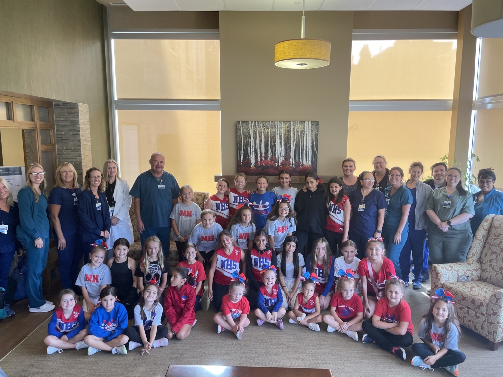 Photo Caption: The Mohawk Valley Health System (MVHS) Cancer Center team receives a generous donation by the New Hartford Pop Warner Cheerleading team.
