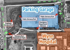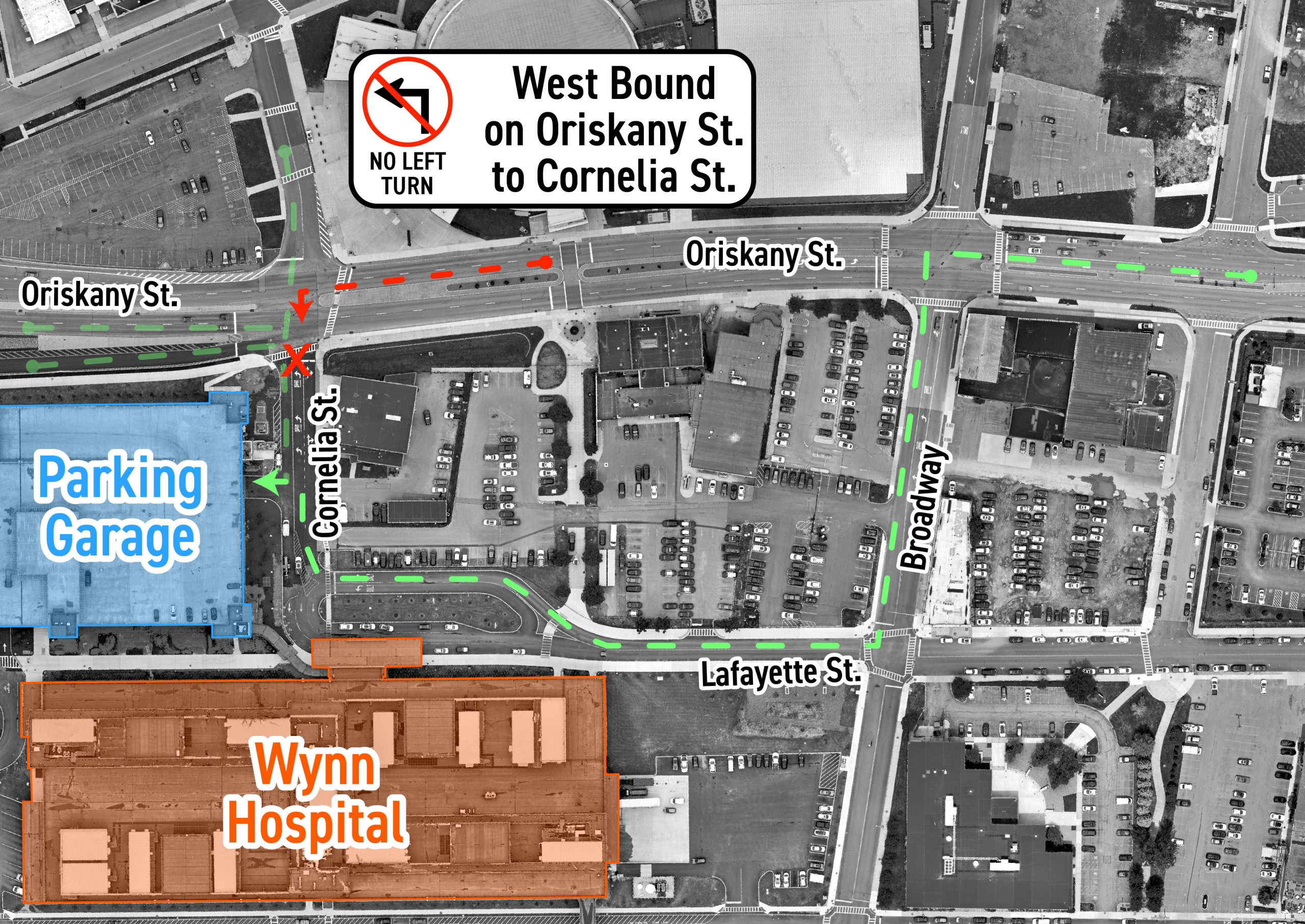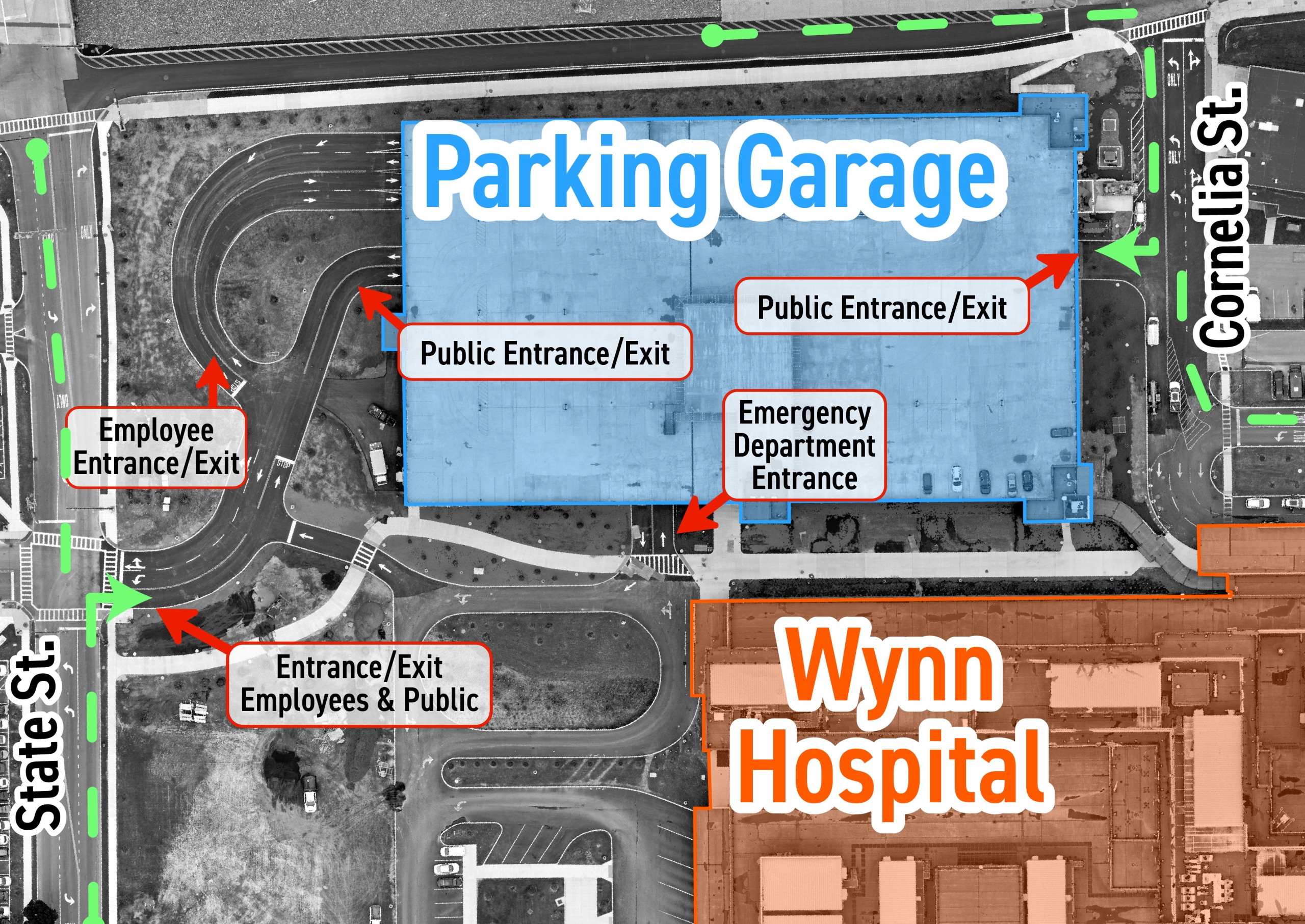 The public can access the garage from entrances on State and Cornelia streets. When heading west on Oriskany Street, drivers must turn onto Broadway and access the garage via Lafayette Street. Paths leading to the public, emergency department and employee parking areas are clearly marked.