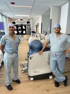 Photo Caption: Prashant Deshmane, MD, (left) and Aymen Rashid, MD, orthopedic surgeons with the MVHS Orthopedic Group, are pictured with the Mako SmartRobotics™ system. Dr. Rashid assisted Dr. Deshmane in surgery.